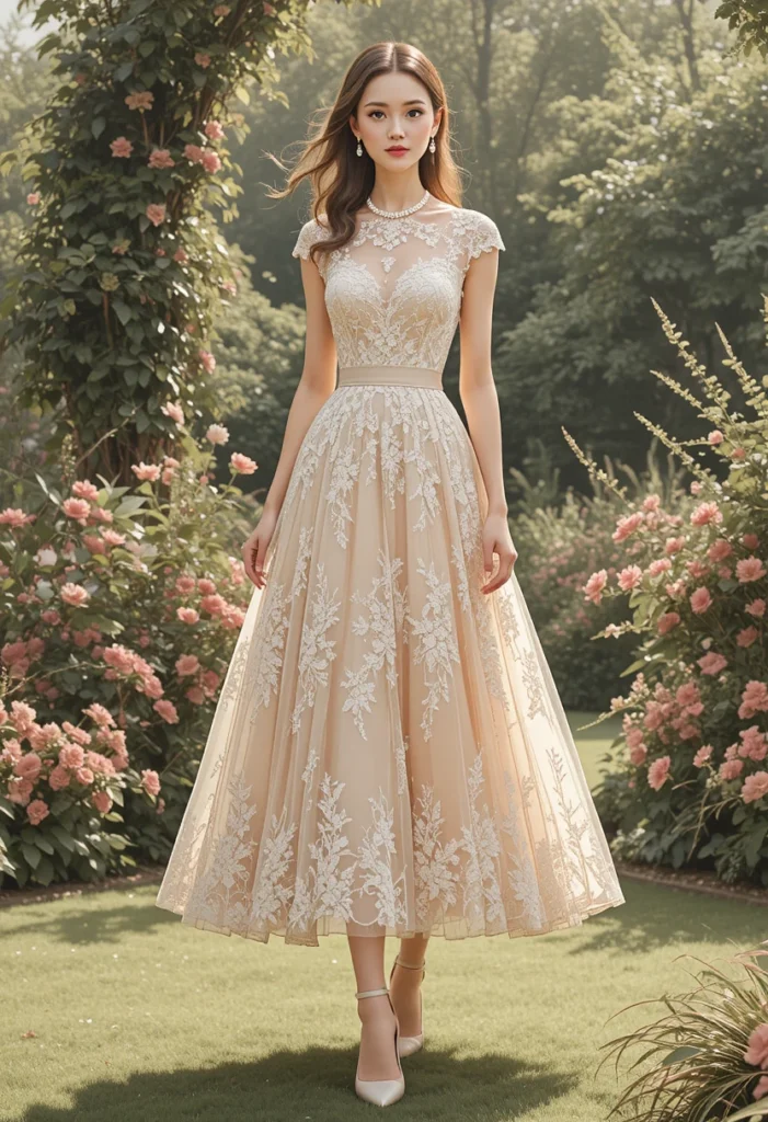 Accessorize with nude pumps or strappy sandals. A soft updo and pearl earrings enhance the delicate texture of the lace, giving you a refined and feminine appearance.