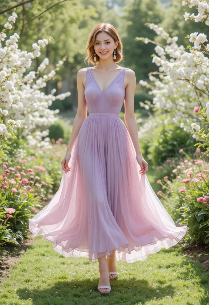The pastel pleated dress is classic with a contemporary twist. Pleats add texture and movement, and soft pastel shades give a delicate, feminine appeal. Perfect for garden or outdoor weddings.
