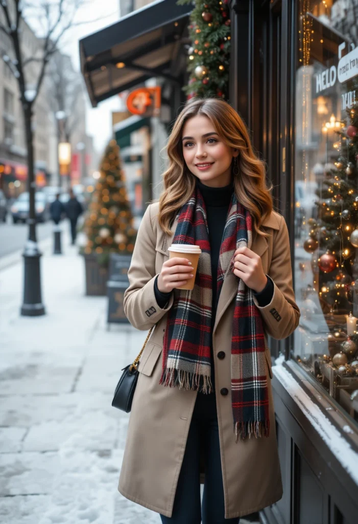A classic trench coat is a great way to bring a bit of sophistication to your winter wardrobe. Layer it over a black turtleneck and pair it with a plaid scarf for some extra festive flair. The plaid adds a bit of holiday spirit while the trench coat keeps the look sharp and tailored. Complete the outfit with black skinny jeans and knee-high boots for an NYC-ready vibe.