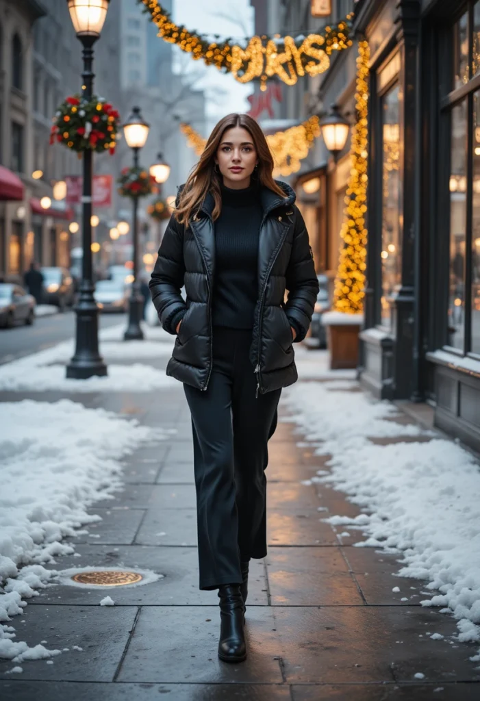 Go for a structured handbag and a beanie to complete the ensemble. This look is perfect for any upscale holiday event or a casual stroll through the festive NYC streets.