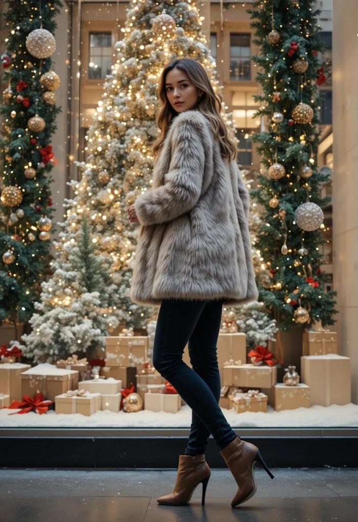 If you’re aiming for a luxurious yet festive look, a faux fur coat is a must-have. Pair it with skinny jeans and heeled booties for a sleek and feminine look. The faux fur adds texture and a sense of opulence to the outfit, while the heeled booties help you achieve that chic city vibe. This combination is great for both daytime festivities and evening holiday parties.