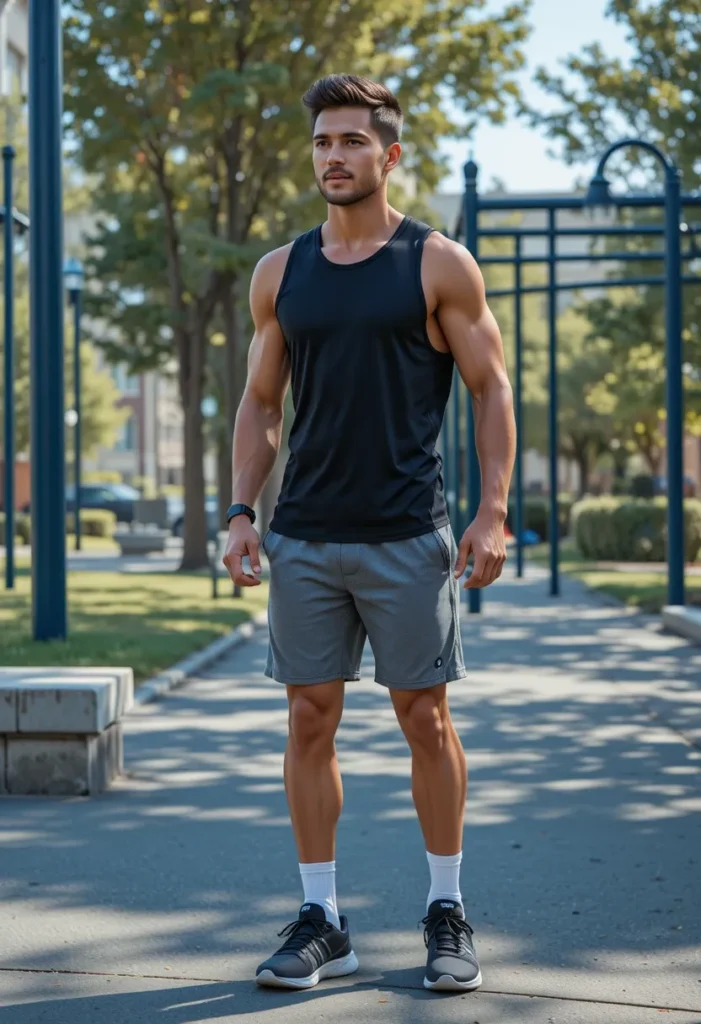 An athletic tank with lightweight shorts gives you maximum comfort at the gym while still looking fresh when stepping outside. The tank keeps things breathable, and the shorts make movement easy — perfect for cardio, lifting, or outdoor workouts. Running shoes keep the entire outfit sporty and sharp.