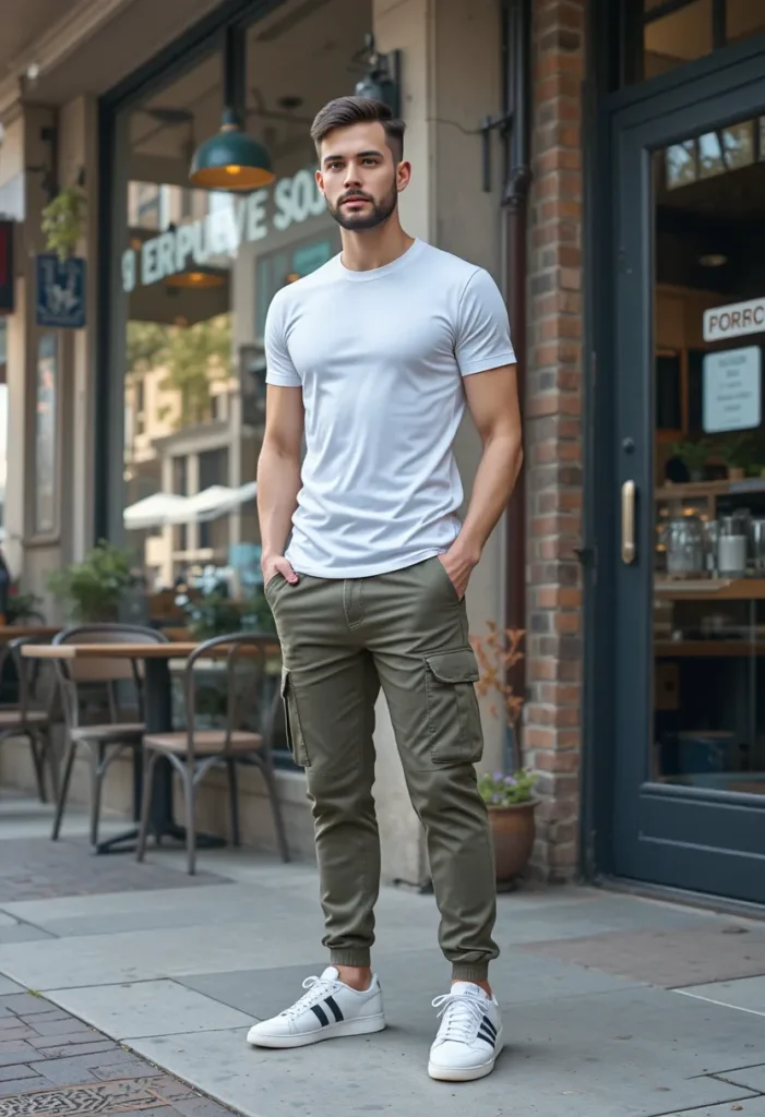 A basic tee with cargo joggers gives you a clean, everyday athletic style that works anywhere. The tee keeps it simple, while the cargo joggers add pockets, structure, and a bit of streetwear flavor. Casual sneakers finish the look with an easy, modern touch.