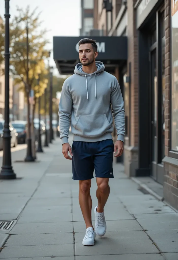 A hoodie paired with gym shorts gives you a relaxed and balanced look that works for both workouts and everyday activities. The hoodie adds a cozy layer that looks good at the gym and still stylish outdoors. Gym shorts keep you comfortable and ready for movement. Sneaker styling ties it all together with a clean, sporty finish.