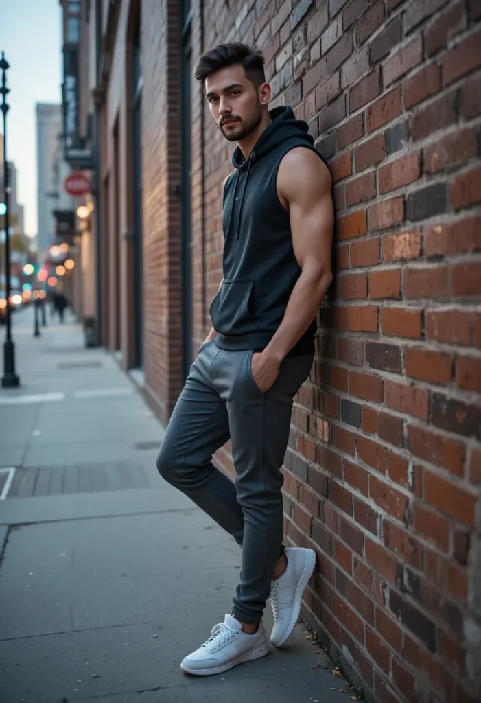 A sleeveless hoodie instantly adds a modern, edgy gym-to-street feel. It shows off your physique while still giving that layered, stylish look. Joggers make the outfit comfortable, and trainers keep the sporty aesthetic clean and versatile.