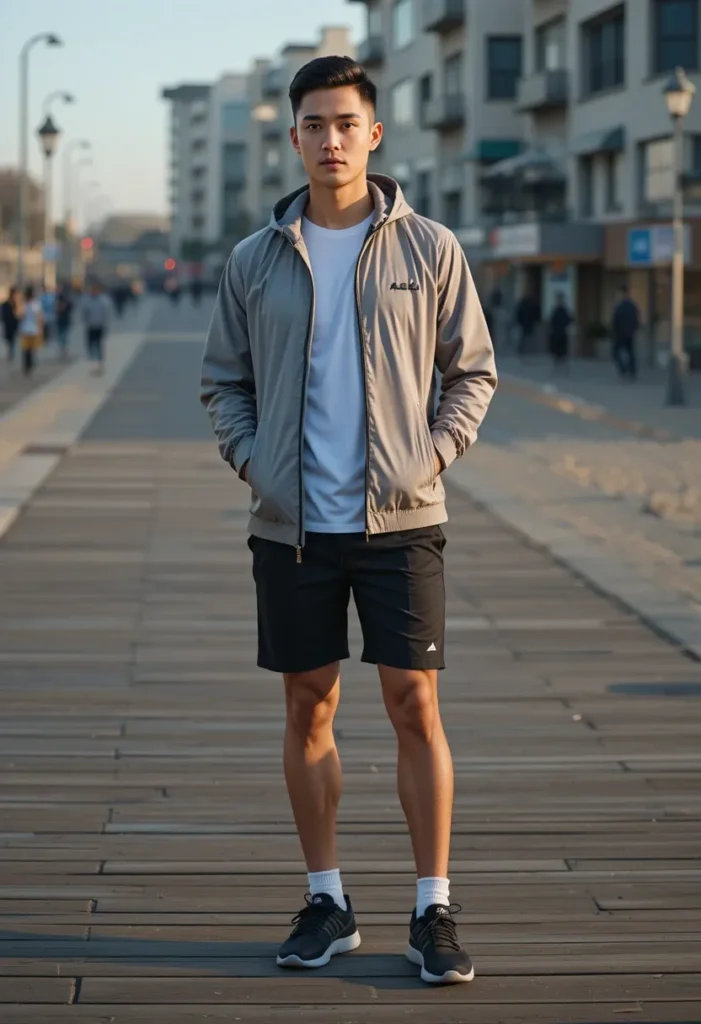 A windbreaker brings that fast, sporty vibe that looks good on the street and performs well at the gym. When you pair it with athletic shorts, you get a lightweight, movement-ready outfit that feels fresh and modern. Training shoes complete the look with maximum comfort and performance.
