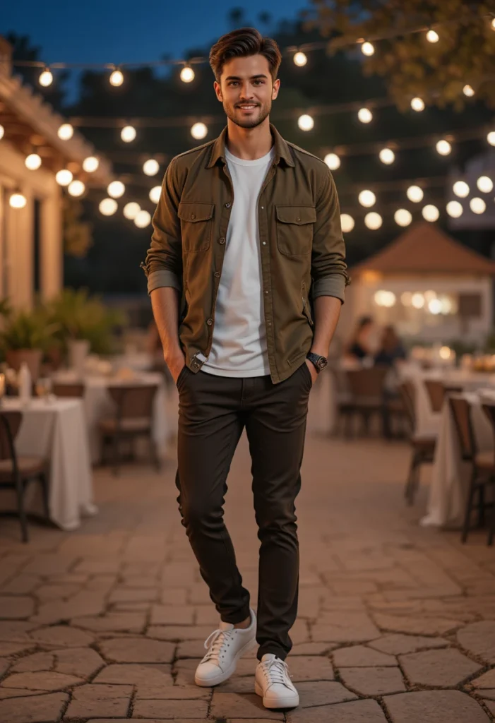 An olive overshirt gives you a warm, earthy vibe that feels relaxed and confident. Layering it over a white tee keeps the outfit simple and fresh, making the colors stand out naturally. This combo works incredibly well because the tones feel calm but still stylish, which makes you look well-dressed without being too bold. It’s the kind of outfit that fits perfectly in any season.