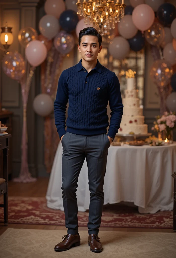A navy knit polo gives a refined touch that’s much more stylish than a regular T-shirt. It has texture, structure, and a soft look that instantly makes you appear more confident. When paired with charcoal trousers, the outfit becomes quietly impressive — perfect for birthday celebrations that feel a bit nicer or more mature. The colors blend perfectly and create a smooth, classy vibe.