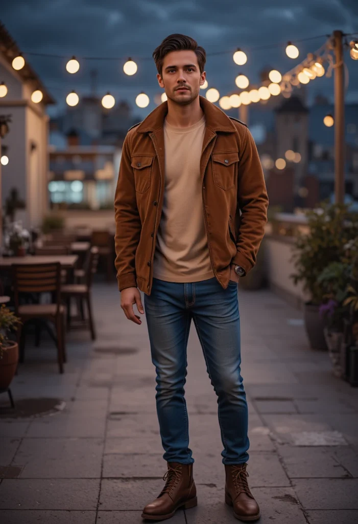 A suede jacket instantly adds a premium feel to your outfit. The texture looks luxurious, and it makes you stand out in a soft, subtle way. When layered over a beige tee, it creates a warm and natural color palette that looks great in any lighting — perfect for both daytime birthdays and evening events. The outfit gives a confident, relaxed vibe that never feels forced.