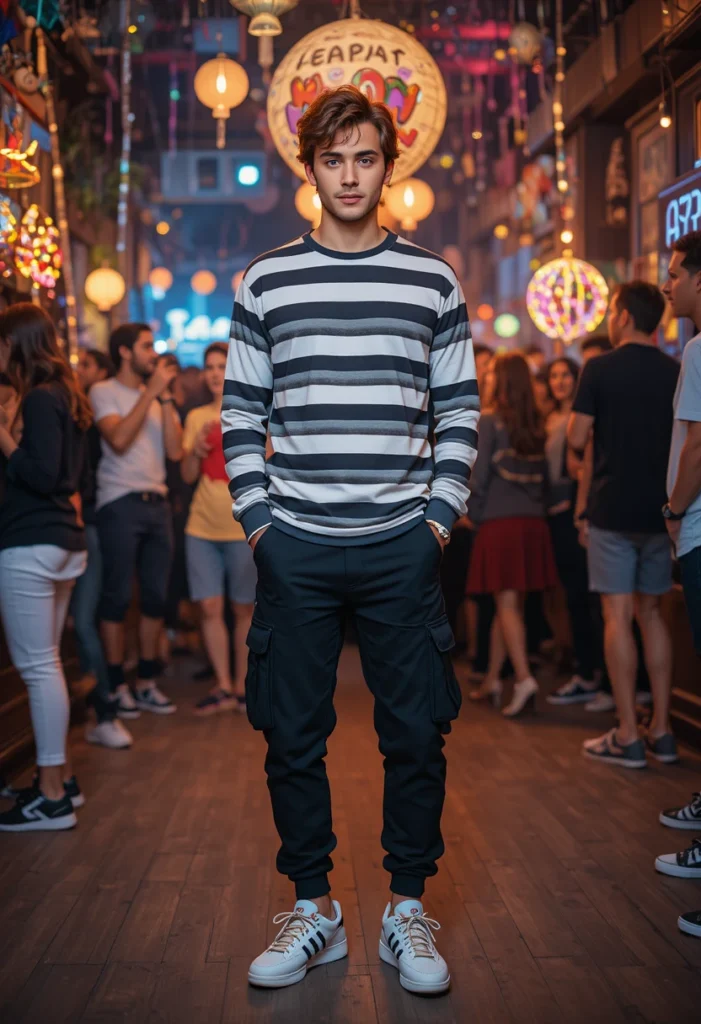 This outfit works great for casual birthday parties, house gatherings, or outdoor celebrations. The cargo pants add flexibility, so you can move around easily without losing style. Pair it with white or black sneakers, and the look becomes complete and perfectly balanced. It’s a simple choice that still feels fun and trendy.