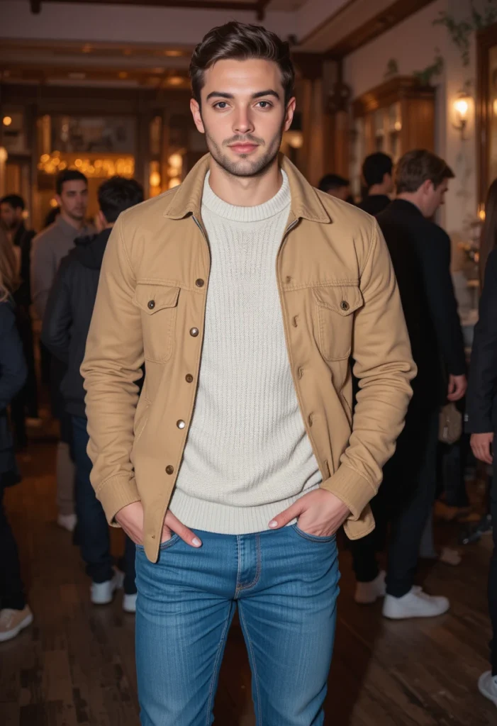 When paired with navy dress pants, the style instantly becomes classy and well-balanced. This combination works great for nicer restaurants, family celebrations, or any event where you want to look impressive. Add loafers or clean dress shoes, and the outfit becomes effortlessly elegant. It’s perfect for guys who want a dressy look without going full suit.