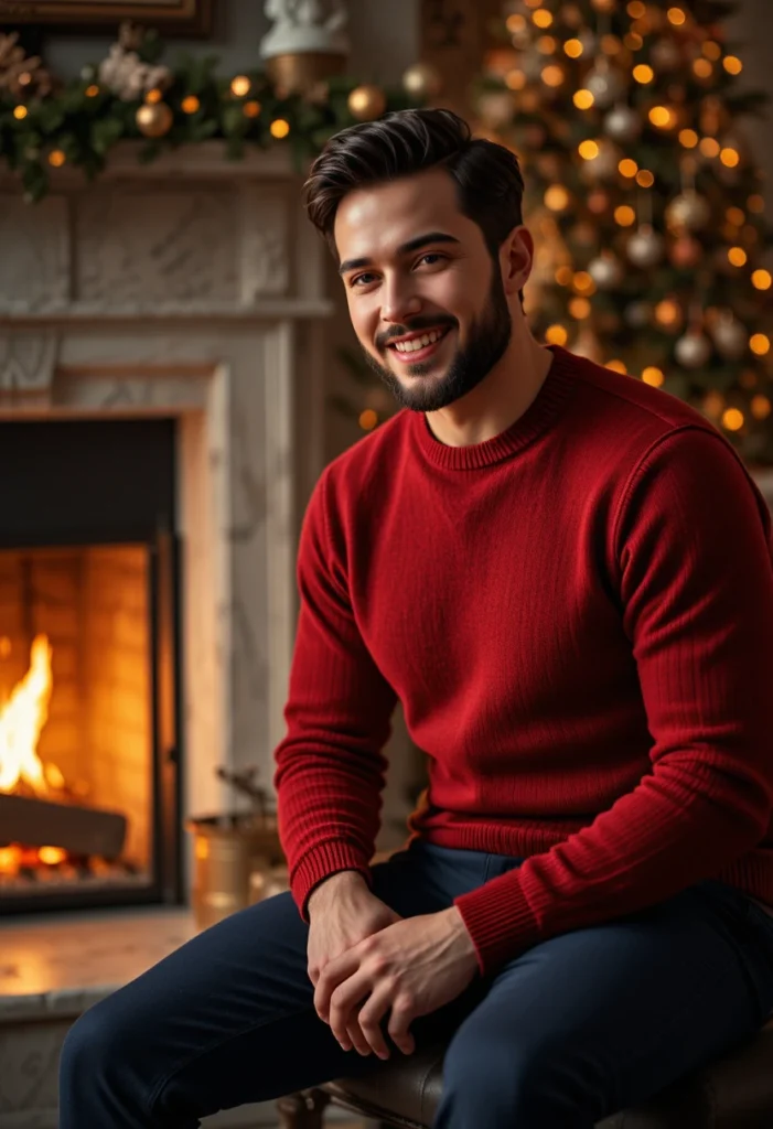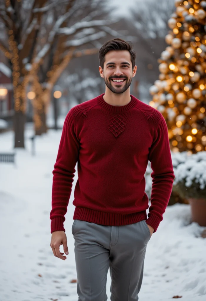 This look works because the red sweater immediately grabs attention without being too flashy. The wool material provides warmth and texture, which is perfect for cooler weather, while the grey chinos keep the outfit grounded and versatile. The combination of red and grey is timeless and can easily be dressed up or down depending on the occasion. Whether you’re visiting family or spending time with friends, this red Christmas outfit for men is both comfortable and stylish.