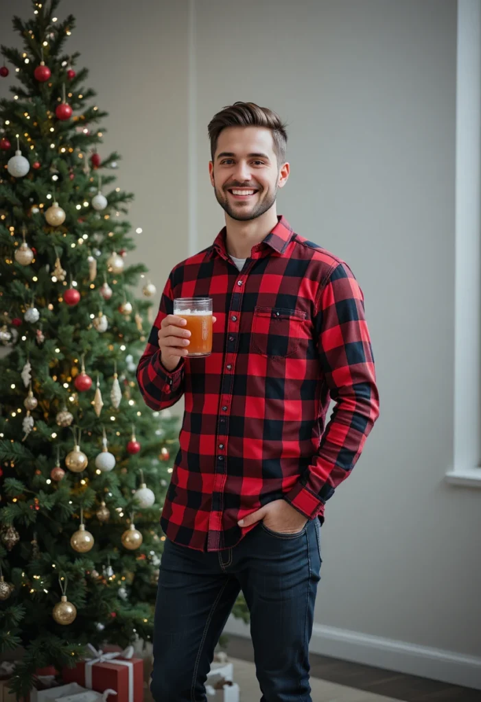 A red checkered shirt paired with dark jeans offers a more laid-back but still chic option for red Christmas outfits for men. The bold red checkered pattern is festive and adds a touch of holiday cheer without being too formal. The dark jeans balance the outfit, making it perfect for a casual Christmas gathering or even an outdoor Christmas market. This outfit works particularly well for those who want a subtle way to incorporate red into their wardrobe without going all in.