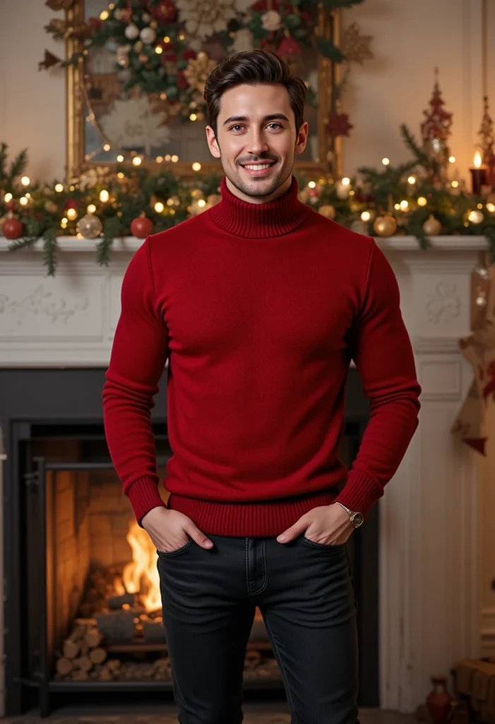 A red turtleneck sweater paired with black jeans is a modern and sleek choice for those who want to make a bold statement while maintaining class. The rich red turtleneck offers warmth and sophistication, while the black jeans provide a streamlined look that doesn’t detract from the outfit’s boldness. This is the ideal combination for a stylish holiday dinner or even a night out at a Christmas party, where you want to look sharp without being overly formal.
