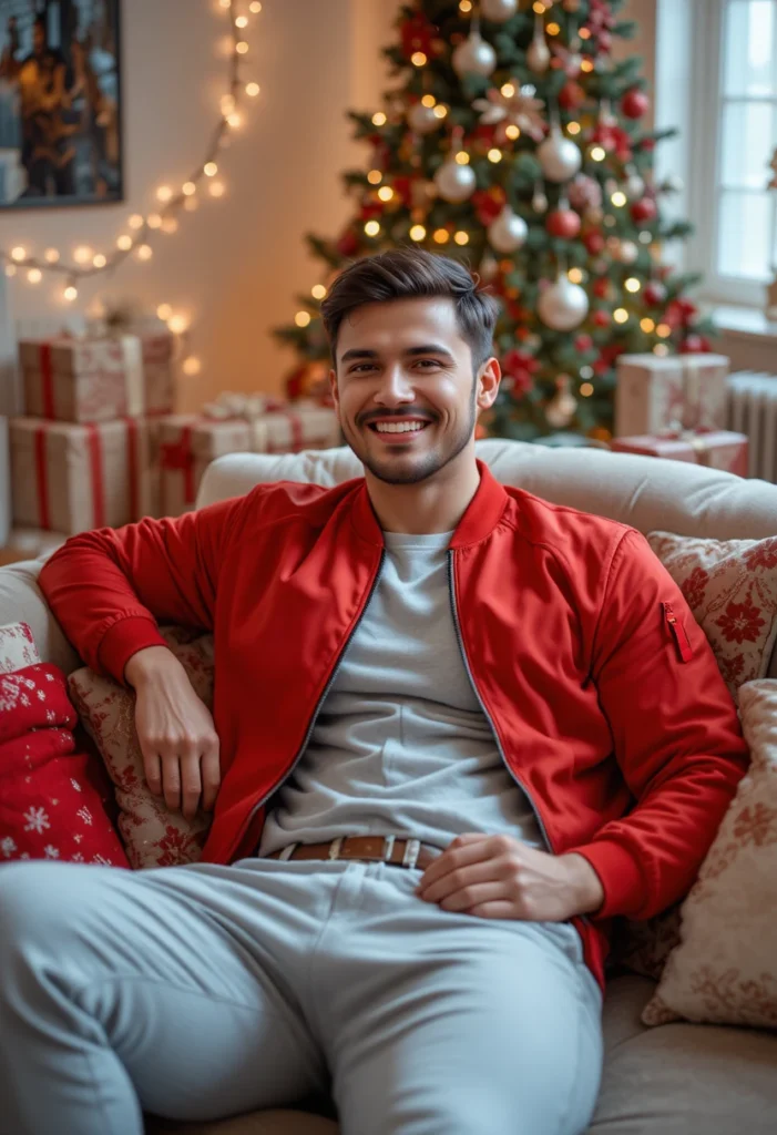 For a comfortable yet bold Christmas look, a red bomber jacket paired with grey sweatpants creates a stylishly relaxed outfit. The red bomber jacket brings an element of sophistication and color to an otherwise casual outfit, while the grey sweatpants keep things comfortable and cozy. This is a great choice for a relaxed day of holiday shopping, lounging with family, or even just running errands while still looking fashionable.
