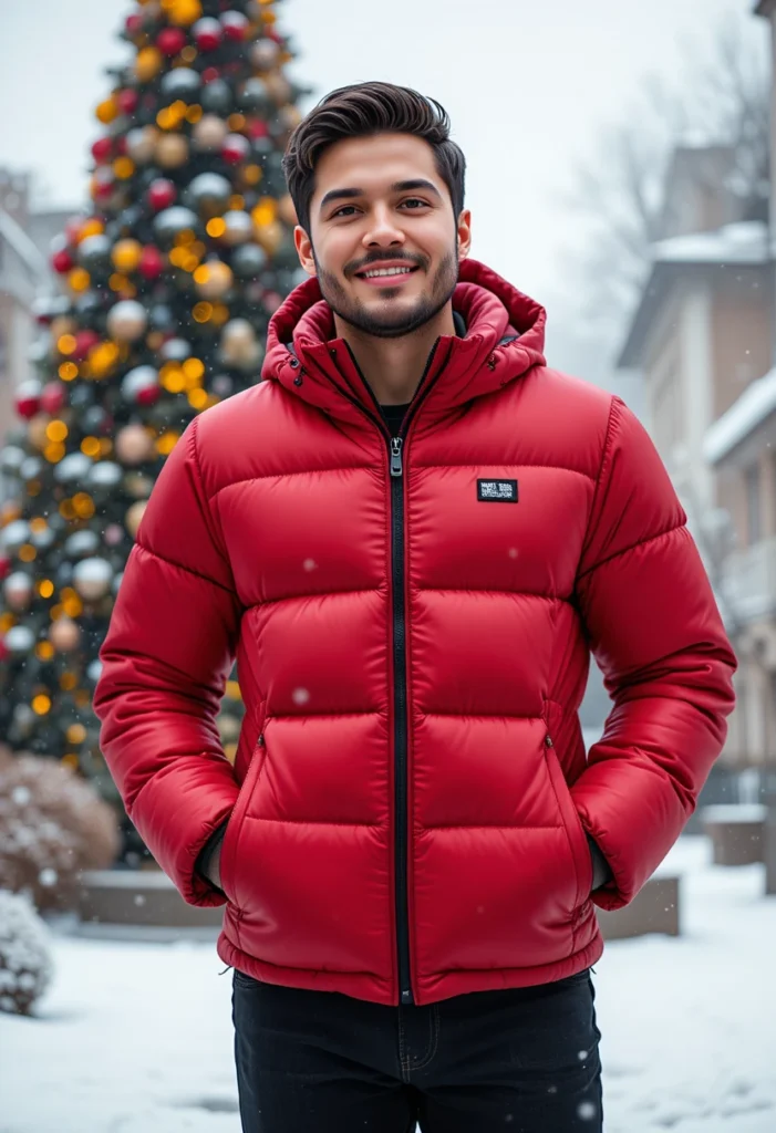For a more utilitarian yet stylish Christmas look, a red puffer jacket paired with black pants is both practical and bold. The red puffer jacket offers warmth and a striking color, perfect for the holiday season, while the black pants keep the outfit grounded and streamlined. This outfit is ideal for outdoor Christmas activities or winter walks, where style meets functionality.