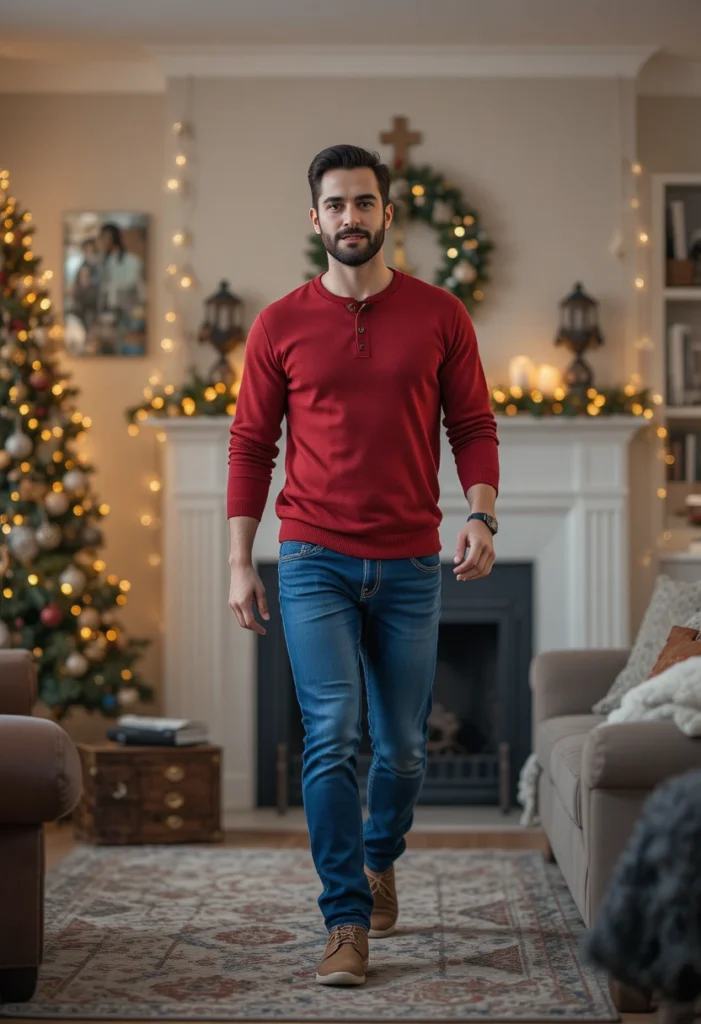 A red henley shirt combined with blue jeans offers a fresh, stylish take on a classic casual Christmas look. The henley shirt’s relaxed fit and button detailing add visual interest, while the red color brings in that bold holiday spirit. Paired with timeless blue jeans, this is a versatile and easy-to-wear look for any casual Christmas event.