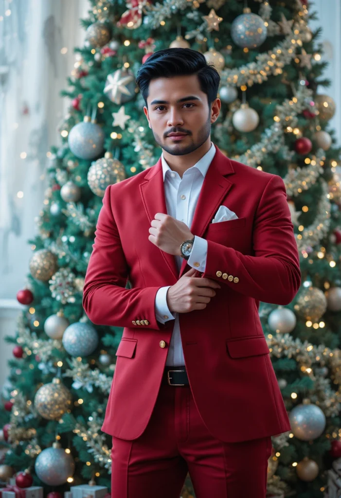The combination of the deep red suit and the sharp white shirt ensures you stand out in a crowd, yet still look classy and polished. It’s a timeless festive ensemble that brings the right amount of holiday cheer without compromising on sophistication. This is a go-to outfit for any formal holiday occasion where you want to look both bold and dashing.