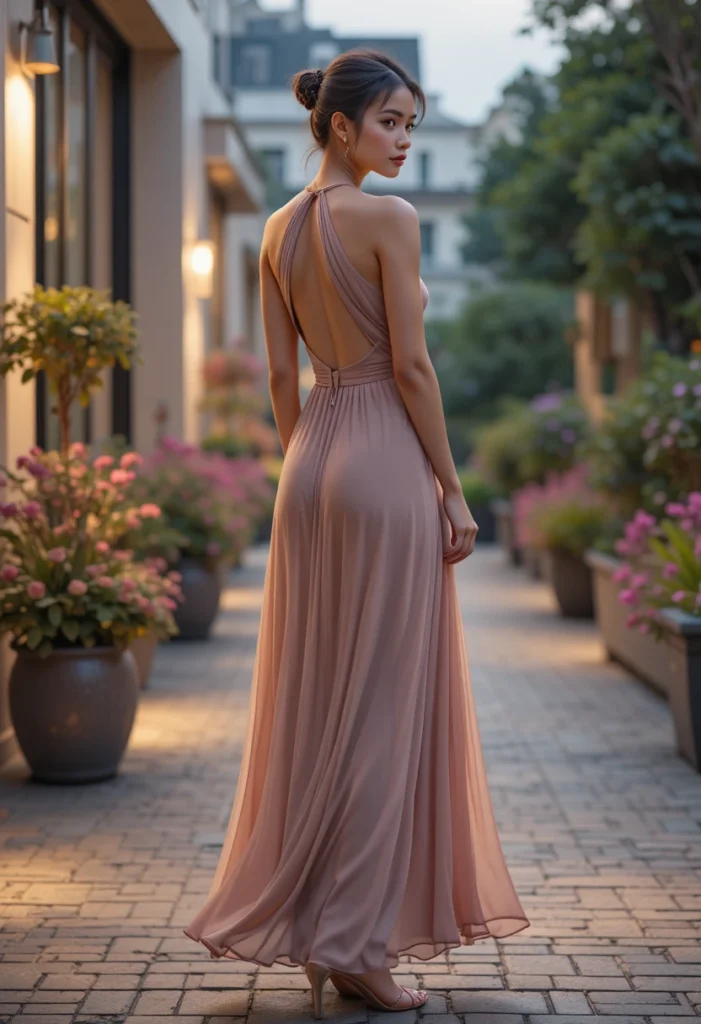 Pair it with minimal sandals and a sleek bun to highlight the neckline and open back. This style is perfect for dinners, date nights, or beachside events where you want something soft yet sophisticated. The simplicity of the dress allows your accessories to shine without taking over the look. A gentle blend of glamor and ease.