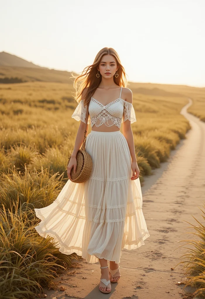 Complete the look with simple sandals and a woven bag to enhance the coastal feel. This combo works beautifully for festivals, beach walks, or sunset picnics where you want comfort with character. The natural textures make the outfit stand out without looking busy or overdone. It’s carefree summer spirit wrapped in one pretty outfit.