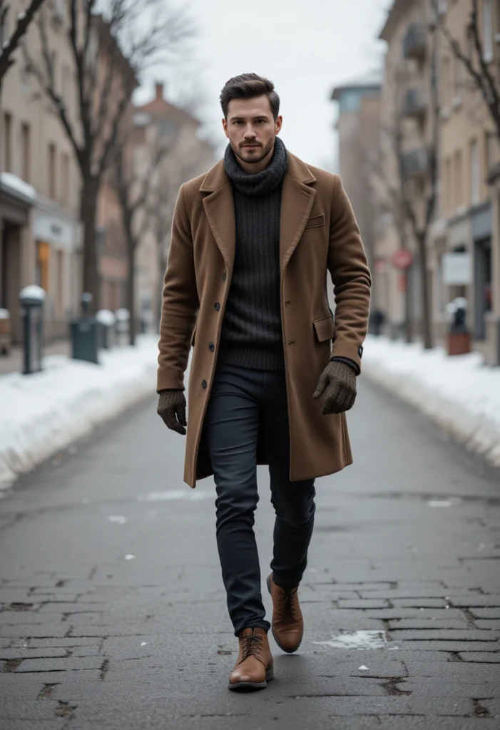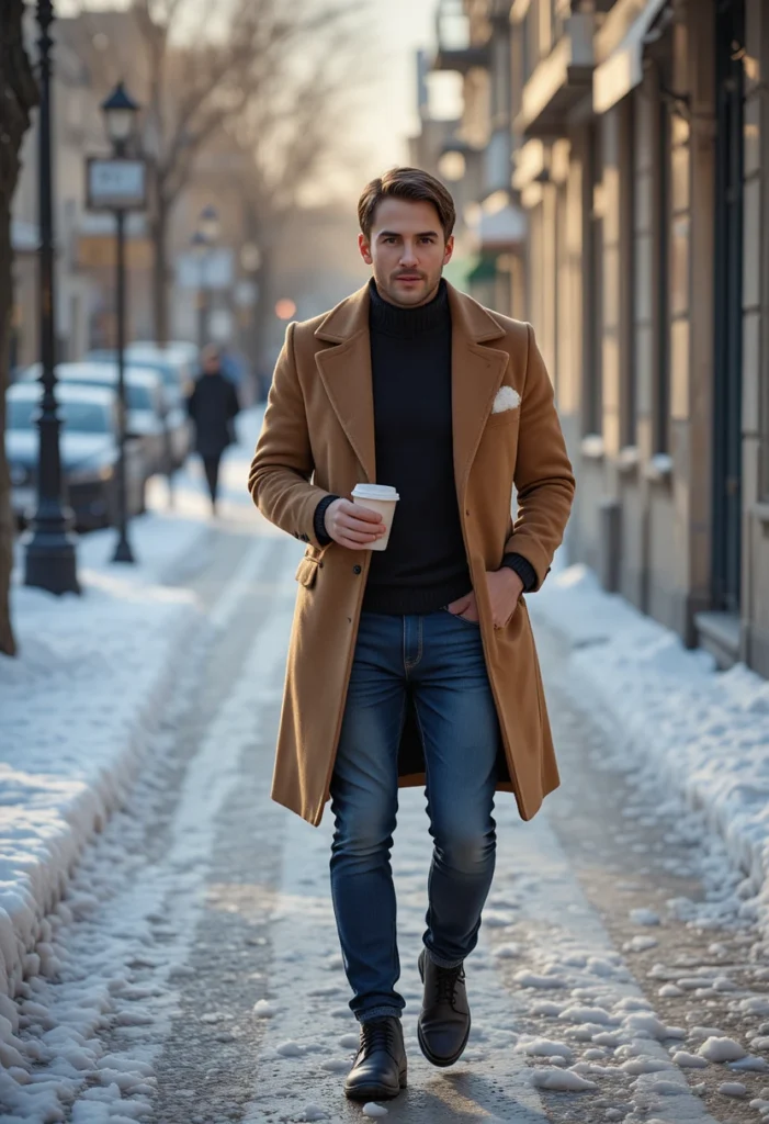 The camel overcoat is a true winter classic that screams sophistication. Worn over a black turtleneck and dark jeans, it creates a refined silhouette perfect for dates, meetings, or city strolls.