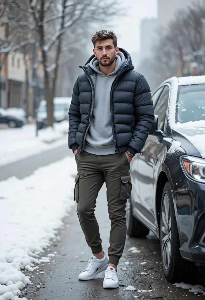 For a casual, sporty vibe, a puffer jacket layered over a hoodie offers unbeatable warmth. Grey tones paired with olive or khaki cargo pants make the look balanced and relaxed.