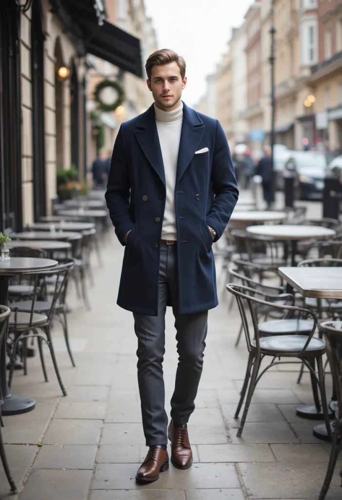 Sophisticated and sleek, this combo blends old-school charm with modern tailoring. The navy peacoat adds authority, while the white turtleneck brightens the overall tone.