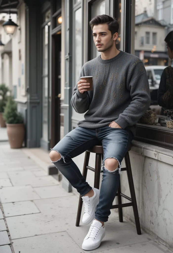 7. Oversized Sweater + Ripped Jeans + High-Top Sneakers