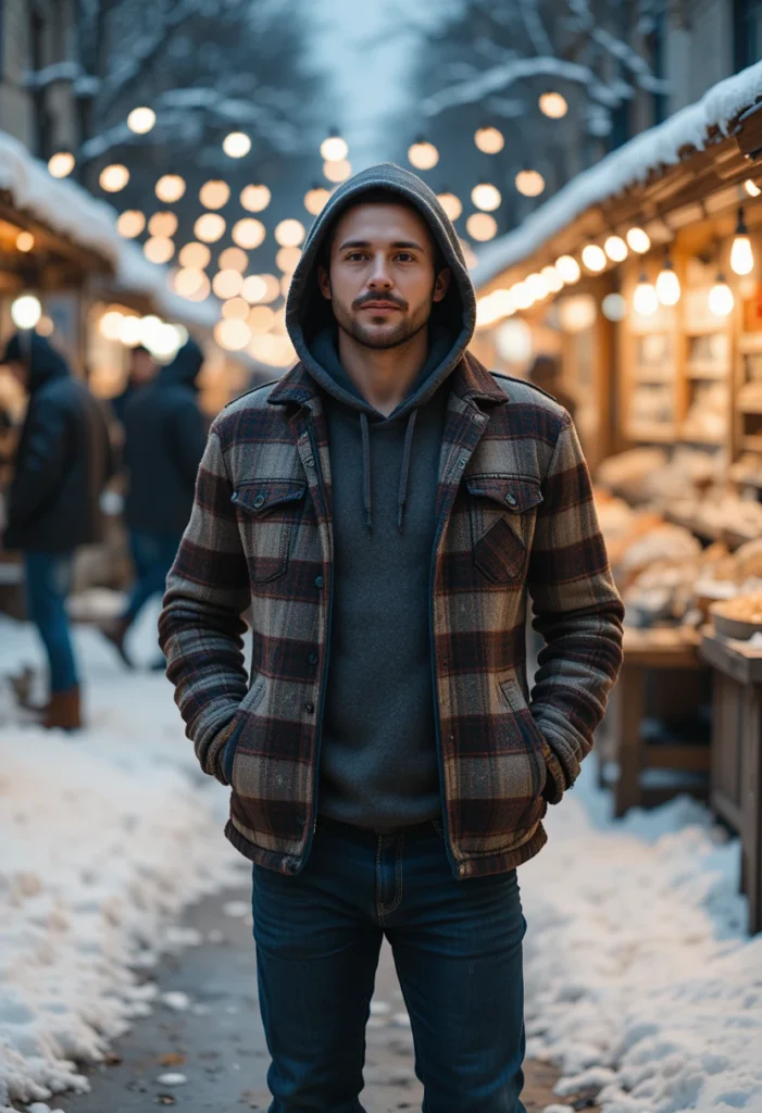 Work boots ground the look with durability and masculine flair. Ideal for casual hangouts or exploring winter markets — stylishly rugged and easy to wear.