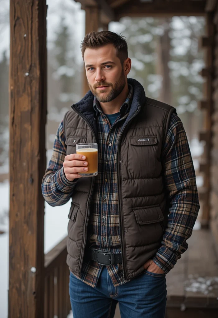 Layering perfection — the quilted vest keeps your core warm without feeling bulky. A flannel shirt underneath adds colour and texture, while a knit sweater adds depth.