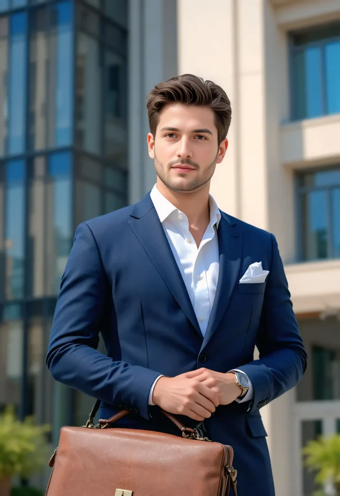 A navy suit is a timeless business essential. Paired with a crisp white shirt and a subtle pocket square, it creates a powerful first impression. Brown Oxford shoes complete the sophisticated look, perfect for presentations or high-profile meetings. It’s the definition of confidence with class — tailored to perfection for modern professionals.