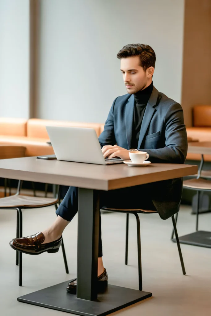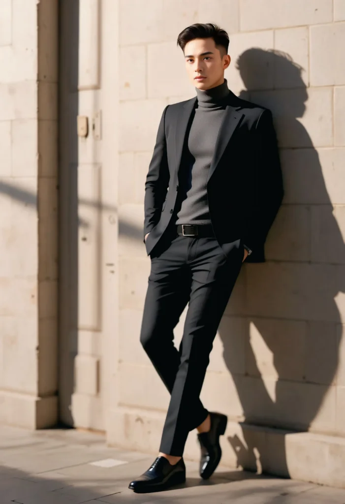 This sleek monochrome combination defines winter business style. The grey turtleneck brings warmth and texture, while the black suit ensures structure. Add monk strap shoes for a sophisticated finish. It’s minimal, confident, and works perfectly for formal environments or corporate evenings.