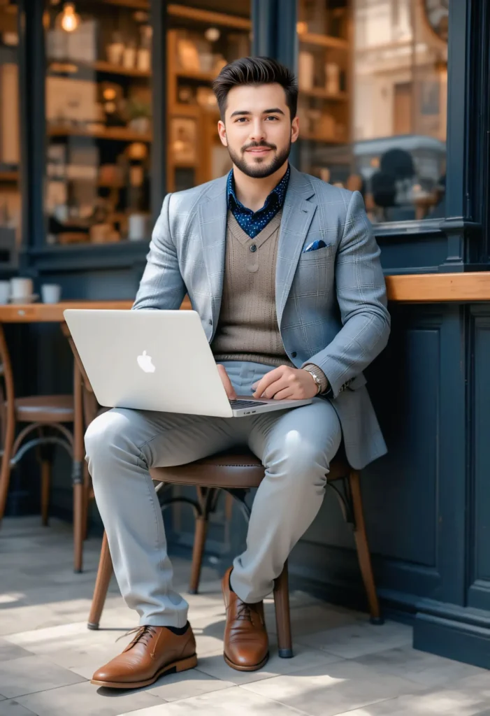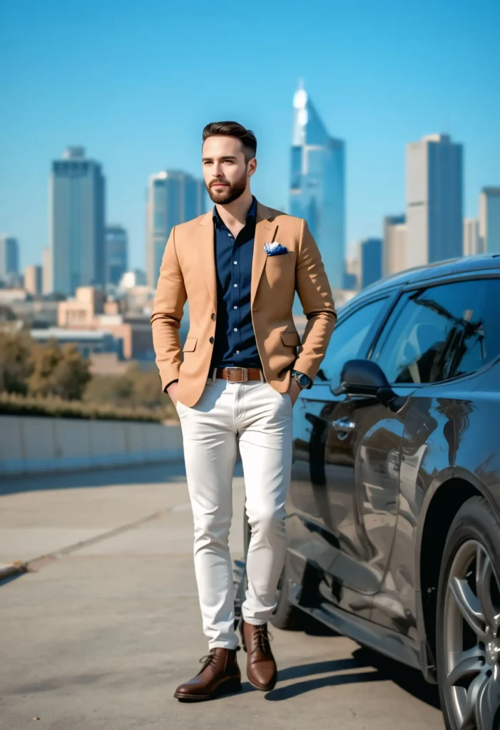 A camel blazer adds warmth and a refined edge to any professional outfit. Combine it with a navy shirt for a rich colour contrast. Grey trousers and Chelsea boots make this look stand out — sharp yet not too formal. Great for networking events or dinner meetings where confidence meets class.