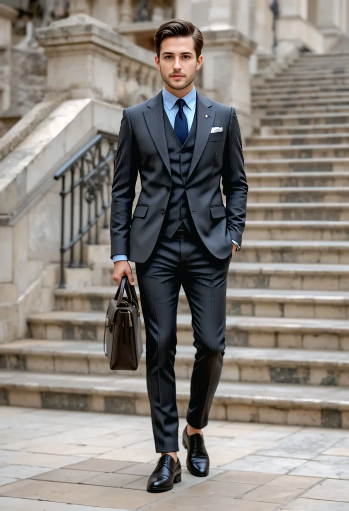A charcoal suit paired with a striped shirt blends traditional business elegance with modern energy. The structured cut keeps you sharp and confident. Derby shoes and a patterned tie add a touch of personality. Perfect for client meetings, conferences, or formal workdays where first impressions matter most.