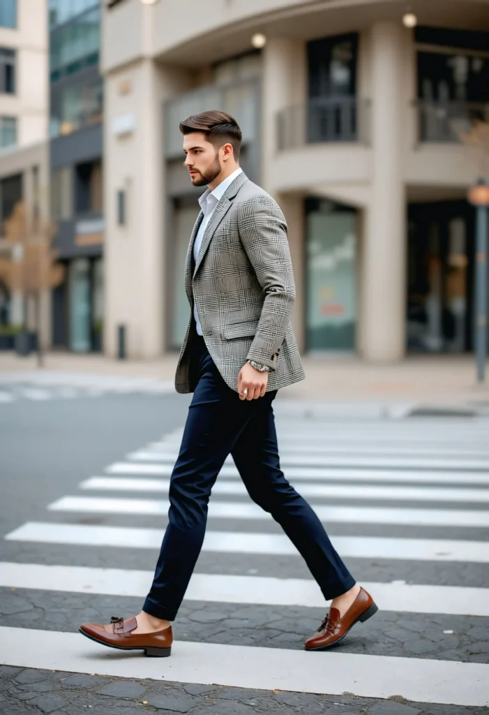 A checked blazer adds subtle pattern play while maintaining formality. When balanced with a solid shirt and dark trousers, it becomes business-ready sophistication. Loafers keep the look light and modern — perfect for office days where you want to blend professionalism with relaxed charm.