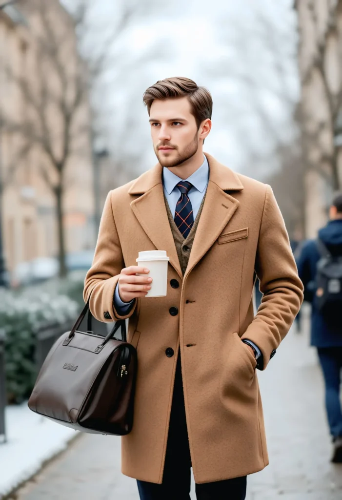 A wool coat layered over your formal wear keeps you warm while maintaining professionalism. Pair it with a classic button-up and slim tie. Dress pants and polished shoes complete the executive look. Ideal for winter workdays when you want to stay classy and comfortable on the go.