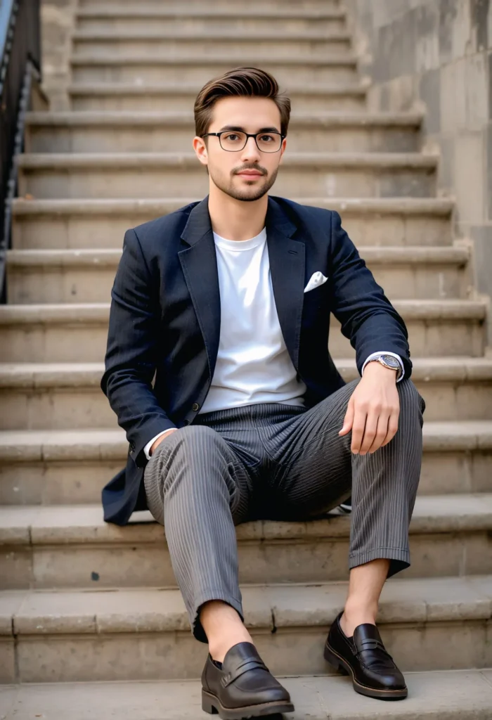 This look merges vintage tailoring with modern ease. The double-breasted blazer brings authority, while the white tee keeps things relaxed. Pleated pants and loafers make it wearable yet elegant — perfect for creative offices or client lunches with a fashionable edge.