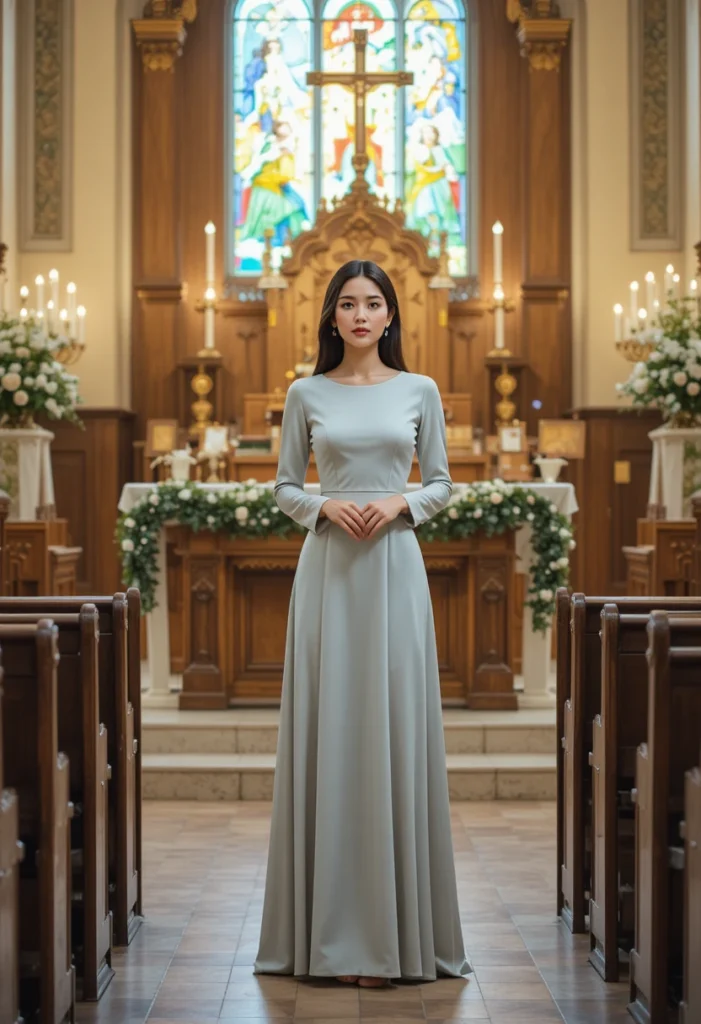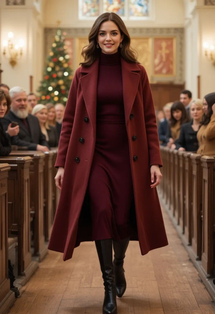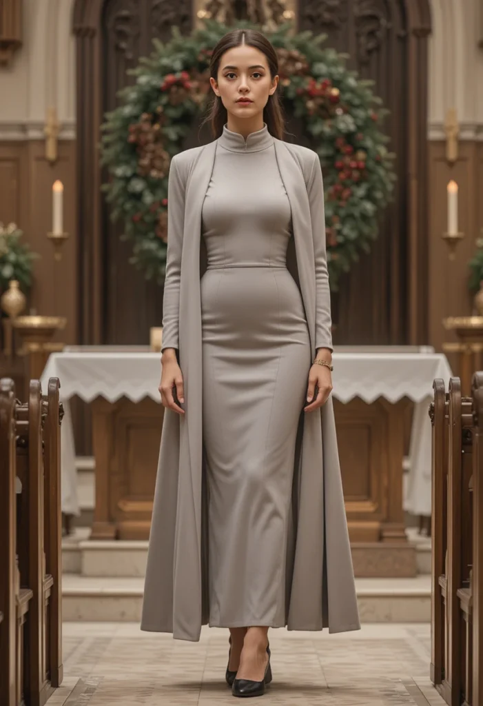 This outfit is a wonderful choice for those who prefer something simple yet stylish. The belt not only adds shape but also enhances the overall silhouette, creating an elegant and respectful look. Pair the dress with knee-high boots or ankle boots to stay warm and stylish throughout the day. It’s a perfect combination of modesty, comfort, and festive elegance for any church gathering.