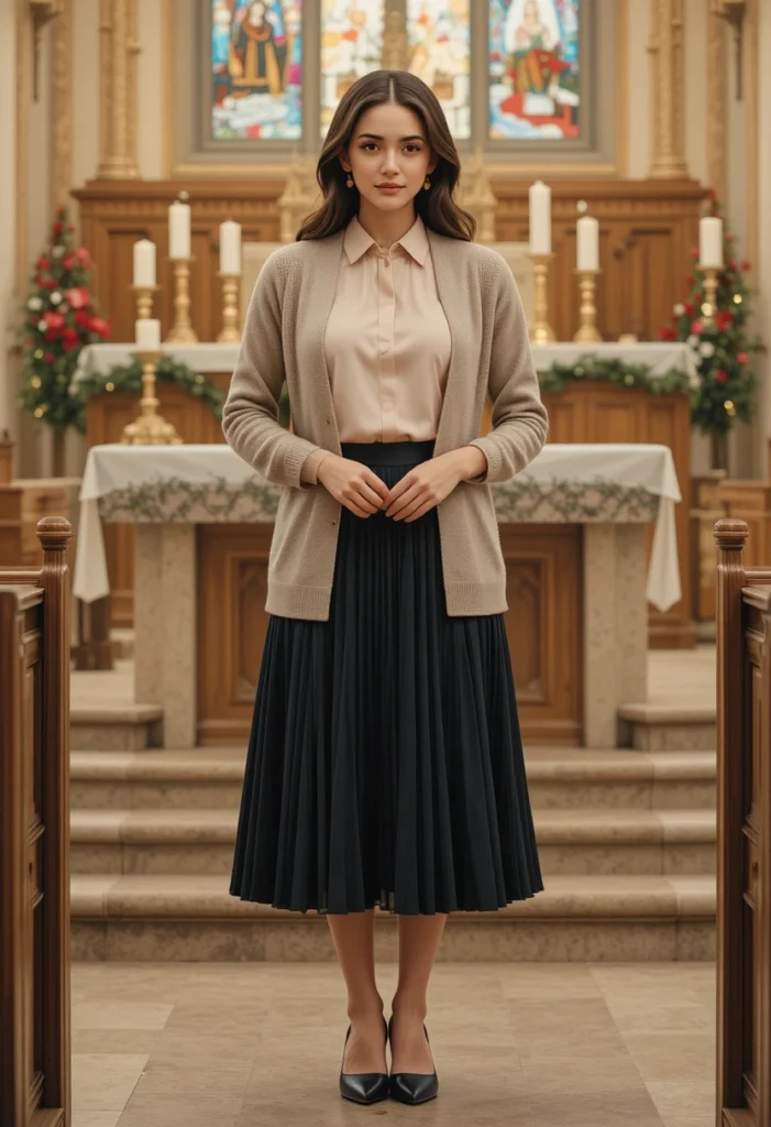 A pleated midi skirt paired with a long-sleeve blouse is a versatile and elegant option for a Christmas church service. The pleated skirt offers movement and grace, while the length ensures that the outfit remains modest and respectful. For the top, choose a long-sleeve blouse in a solid color or subtle print that doesn’t detract from the overall simplicity of the look.