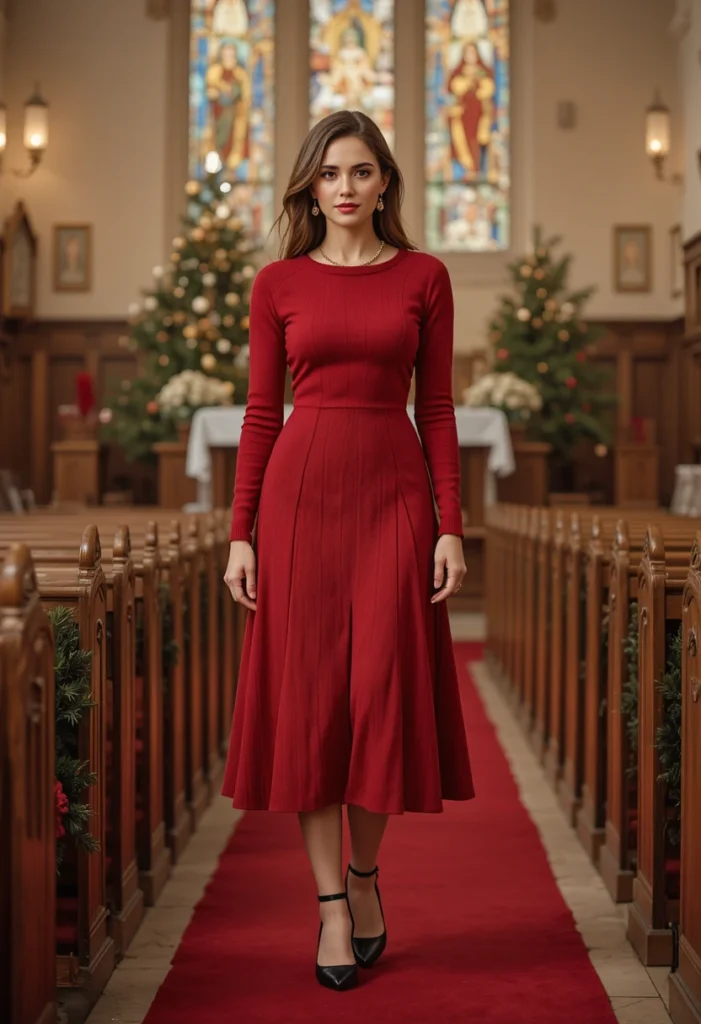 A midi dress with a high waist and pleated skirt is a charming and elegant choice that works beautifully for Christmas church services. The high waist elongates the figure, creating a flattering silhouette while maintaining modesty. The pleated skirt adds movement and grace, making it a perfect combination of style and comfort. Choose a dress in festive colors like burgundy, deep green, or gold accents to bring out the holiday spirit without being too flashy.