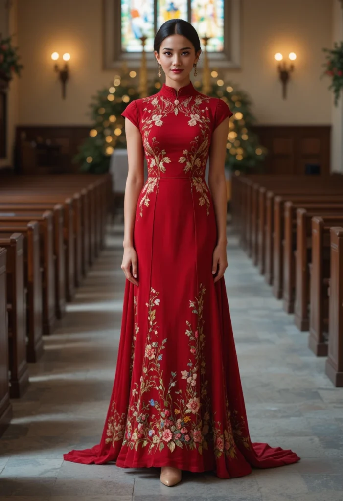 A high-neck dress with subtle floral embroidery is an exquisite choice for Christmas church services. The high neck ensures modesty while still allowing for a flattering silhouette. Choose a dress made from soft fabrics like cotton, knit, or wool blends to keep you warm during the chilly holiday season. Floral embroidery adds a festive touch without being too bold, giving your outfit an elegant and Christian-friendly feel perfect for the season.