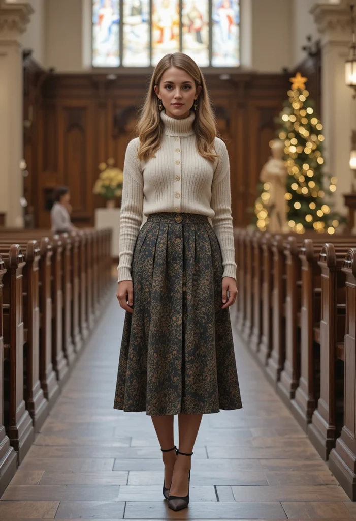 For a sleek, professional, and modest look, a long-sleeve turtleneck paired with a pencil skirt is a sophisticated outfit choice for Christmas church services. The turtleneck provides full coverage while remaining stylish, and when paired with a fitted pencil skirt, it creates a flattering, elegant silhouette. Opt for a pencil skirt that hits at or just below the knee for a conservative yet chic look.
