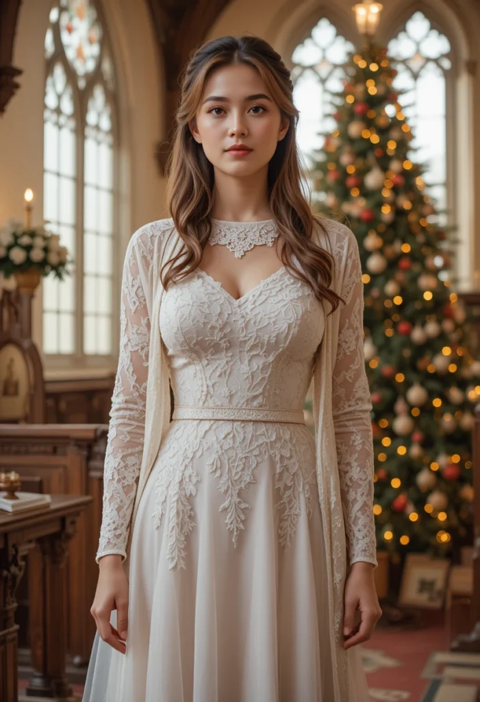 A long-sleeve lace dress is a delicate and feminine choice that perfectly blends modesty with elegance for Christmas church services. The lace detail adds a subtle touch of sophistication, while the long sleeves ensure that your outfit is fully covered. A lace dress in a deep, festive color like emerald, red, or navy brings a beautiful balance of elegance and celebration to the occasion.