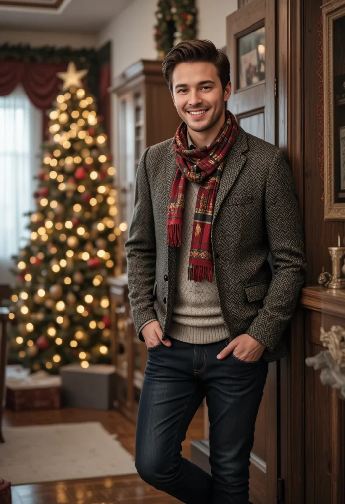 If you’re attending a more relaxed holiday event, consider a tweed blazer paired with dark jeans. This combo is a more laid-back option for Christmas formal outfits for men, offering a balance of comfort and style. The textured fabric of the tweed blazer adds warmth and depth, making it a great choice for chilly winter evenings.