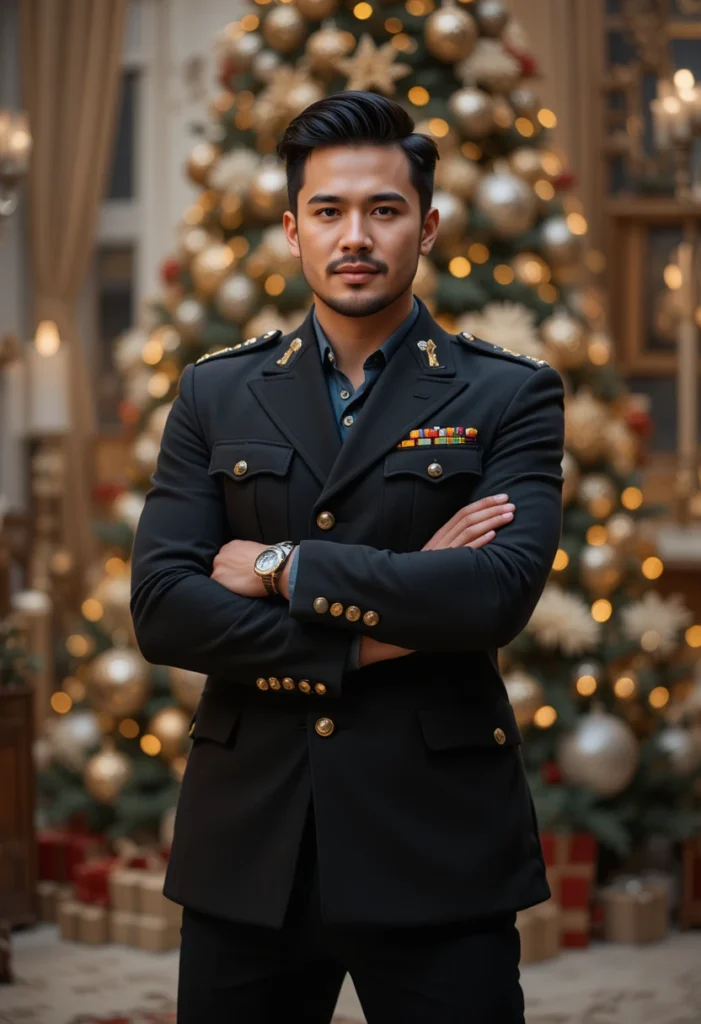 A military-inspired blazer is a unique choice for Christmas formal outfits for men, offering a structured, sharp look with bold details like brass buttons. This outfit is ideal for those who want to stand out while keeping things classy and formal. Pair the blazer with sleek black dress pants to balance the bold top with a more subdued bottom.