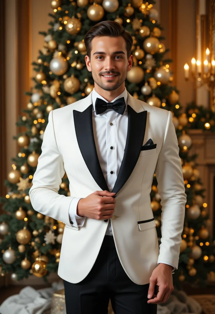 For a truly standout Christmas formal outfit for men, the white dinner jacket is a bold yet classy option. This outfit is a nod to old Hollywood glamour, perfect for more upscale events such as a formal Christmas gala or a black-tie holiday event. The white jacket contrasts beautifully with black trousers, a black bow tie, and shiny black dress shoes, creating a sophisticated and timeless look.