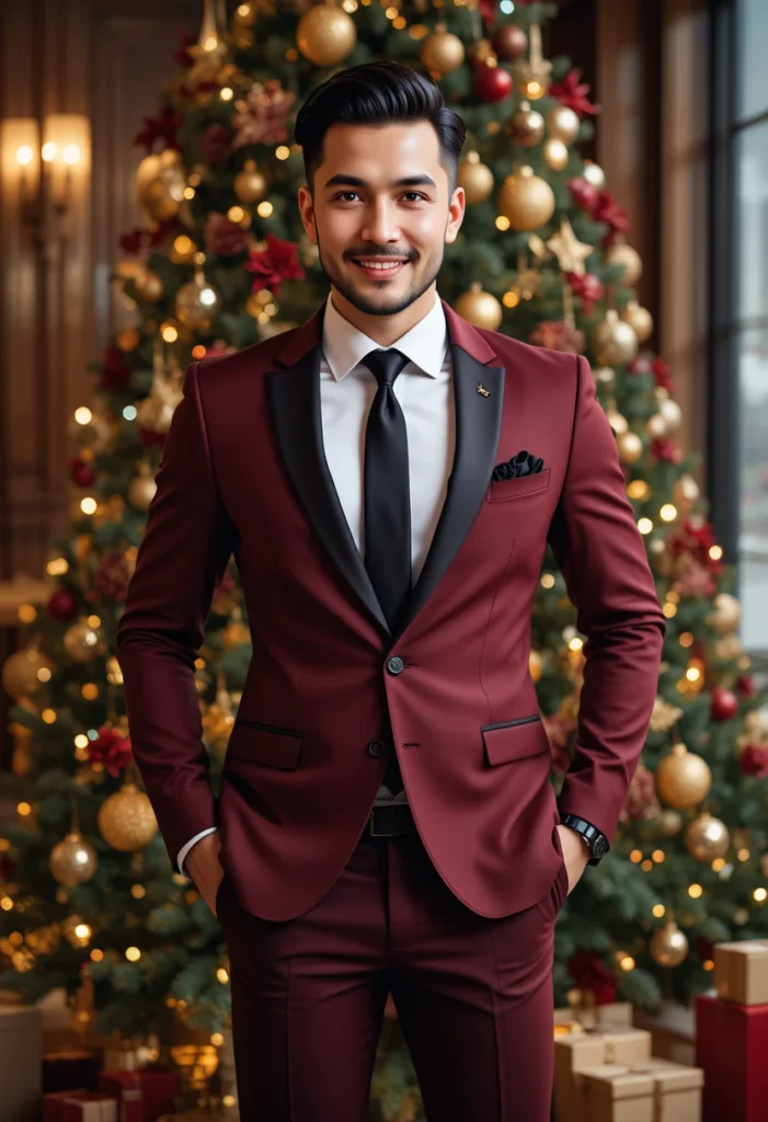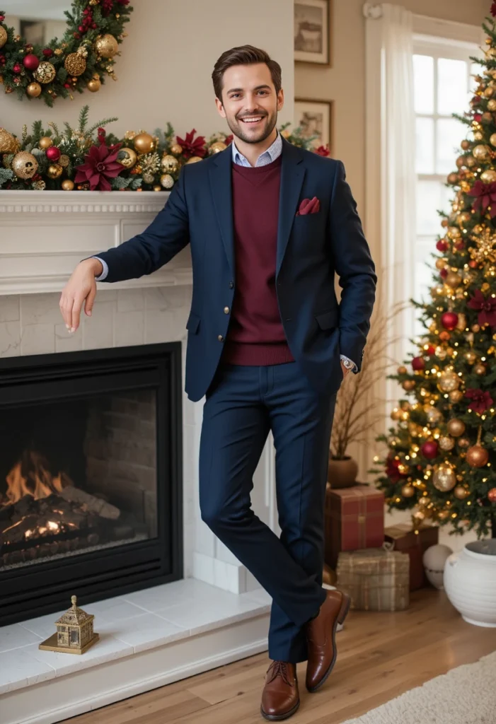 For a bold and stylish take on Christmas formal outfits for men, a burgundy suit is an excellent option. The deep red hue is perfect for the holiday season, offering a festive flair while still remaining sophisticated. Pair the suit with black accessories like a black tie, cufflinks, and leather shoes to balance the rich color.
