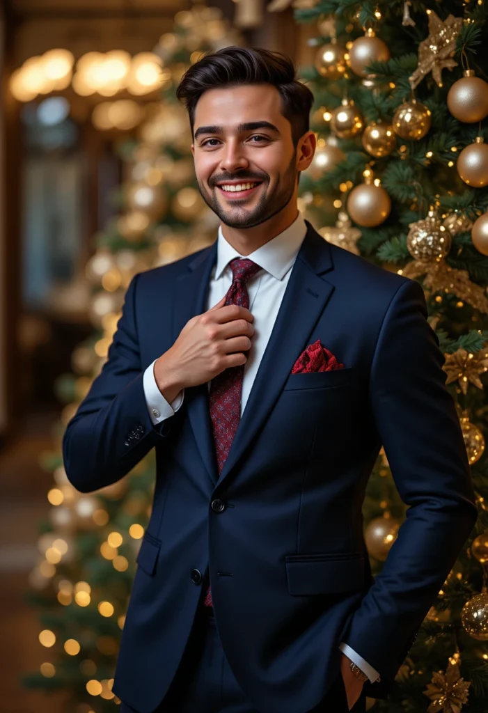 A navy suit is one of the most versatile Christmas formal outfits for men, offering a refined and classic look that suits almost any holiday occasion. Navy pairs beautifully with festive accessories like a red or gold pocket square, which injects a little holiday spirit into the ensemble. This suit is a great option for both daytime and evening events, whether it’s a Christmas lunch or a formal dinner party.