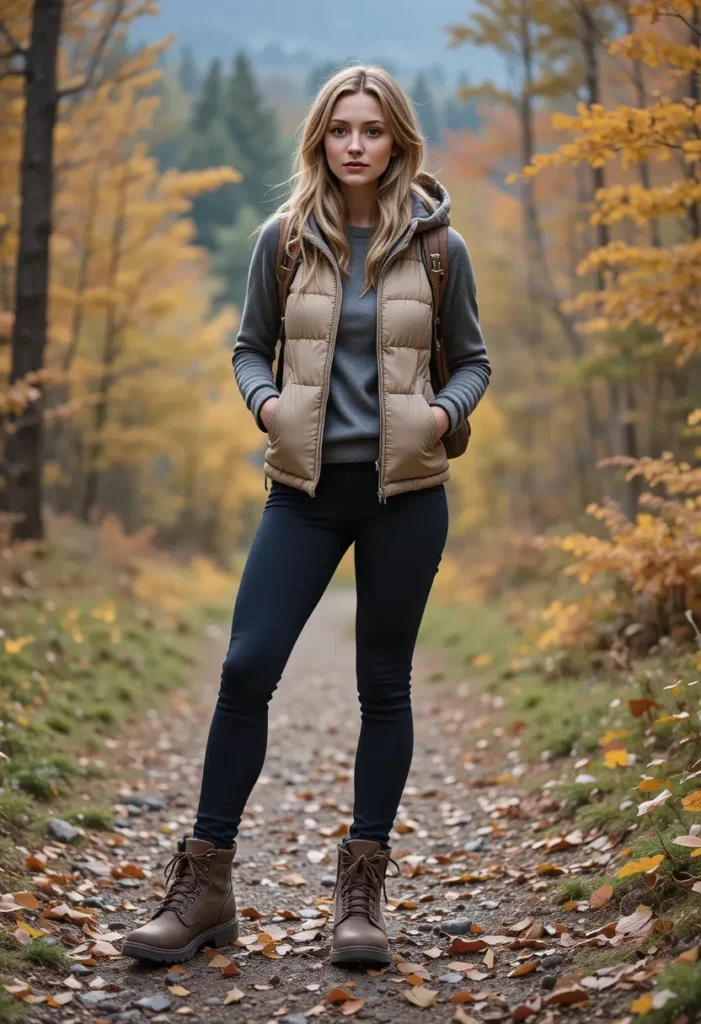 This outfit is perfect for those active fall days when you want to be stylish but still practical. The hiking boots make the look functional, while the puffer vest gives it a bit of sporty flair. Throw on a beanie or a knit hat, and you’re set for any fall activity.