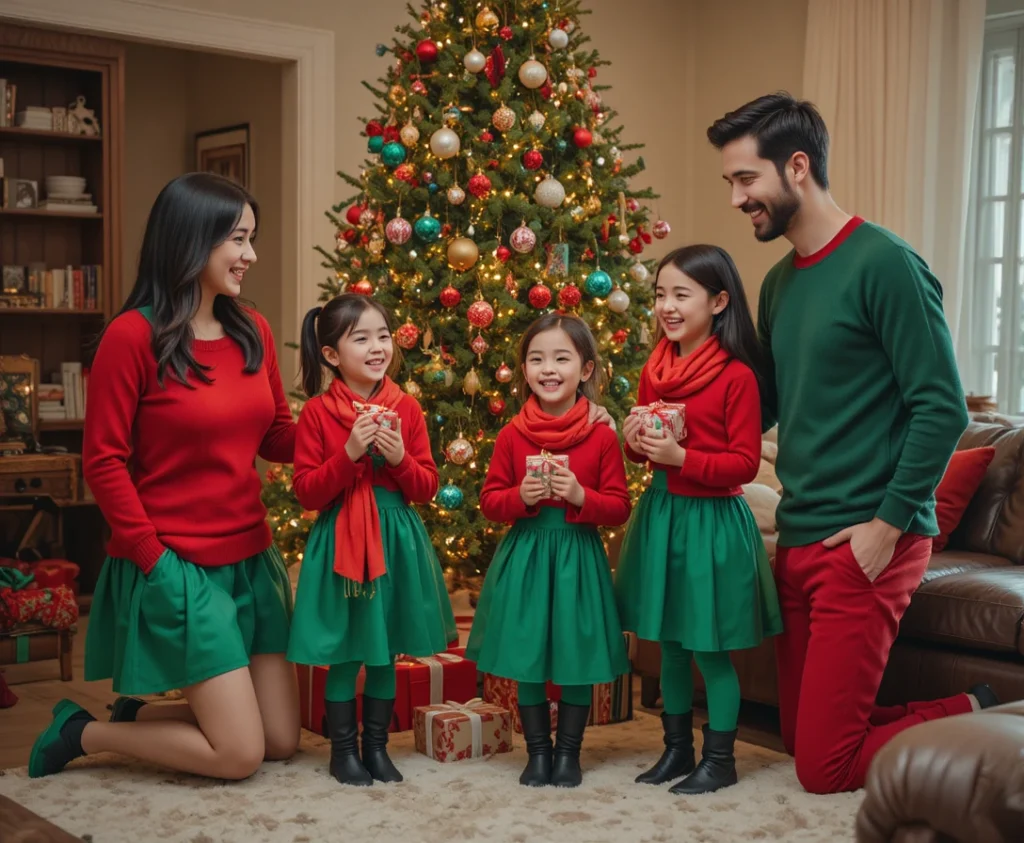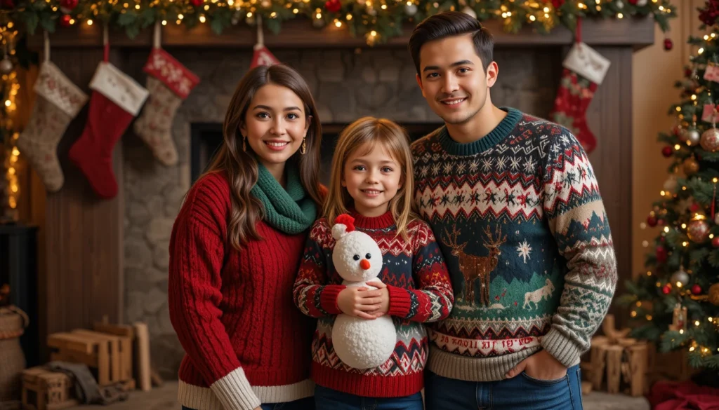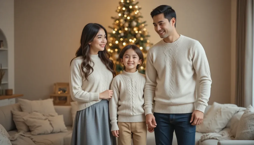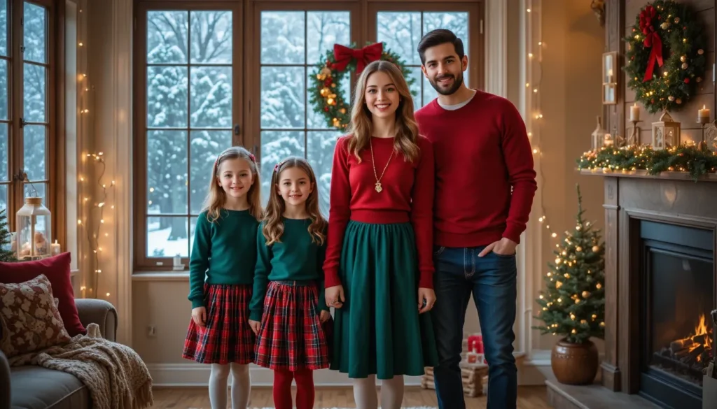 Nothing says Christmas like the perfect winter sweater. A cozy knit sweater is a great option for the whole family, offering warmth and style. Dad can wear a neutral-colored sweater, while mom’s outfit could feature a more festive design—think snowflakes, reindeer, or a cable-knit sweater in red or green. The kids can also wear simple winter sweaters, and you can all finish off the look with matching scarves and beanies for everyone.